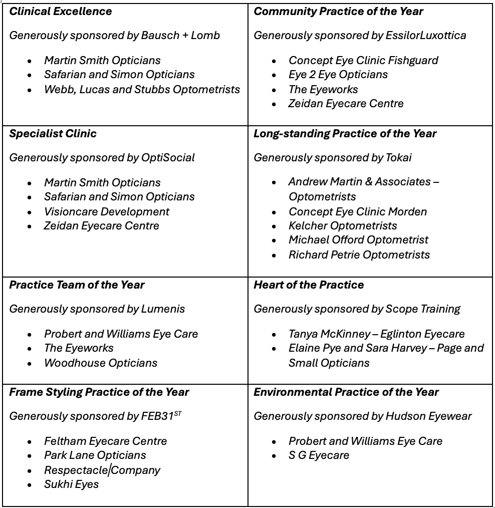 This year’s shortlist reflects the breadth and strength of independent optometry, with finalists recognised for their commitment to clinical excellence, exceptional patient care, team development, sustainability and community impact.